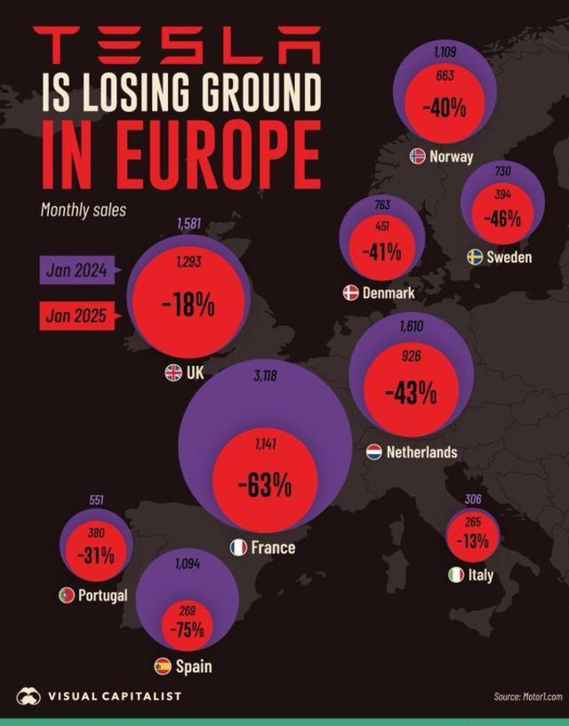 从欧洲各国的市场反馈来看,特斯拉的“失宠”几乎是全方位的。在对纯电车接受度最高的挪威,特斯拉销量持续下滑;在德、法等传统汽车强国,本土品牌的崛起不断挤压其生存空间;即便是脱离欧盟的英国,也出现了抵制马斯克的组织,街头随处可见反马斯克的标语;而在西班牙,特斯拉销量同比跌幅高达75%,堪称“恐慌性抛盘”。这种集体性的市场冷淡,与特斯拉此前在欧洲的强势表现形成鲜明对比。曾几何时,特斯拉凭借Model 3、Model Y的科技感与品牌力,几乎垄断了欧洲中高端纯电市场,如今却沦为“被抛弃的选择”。
