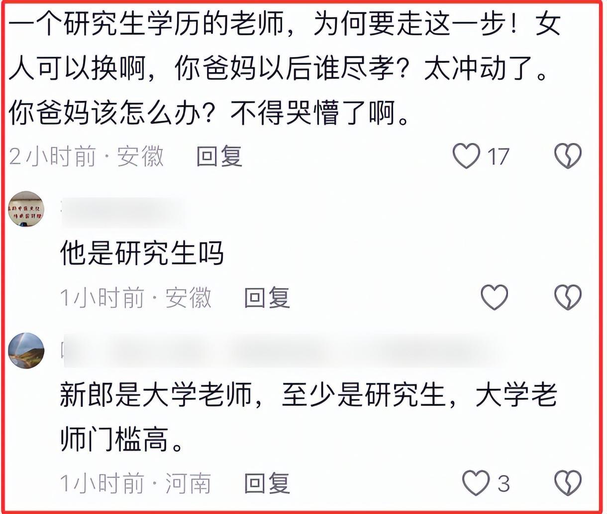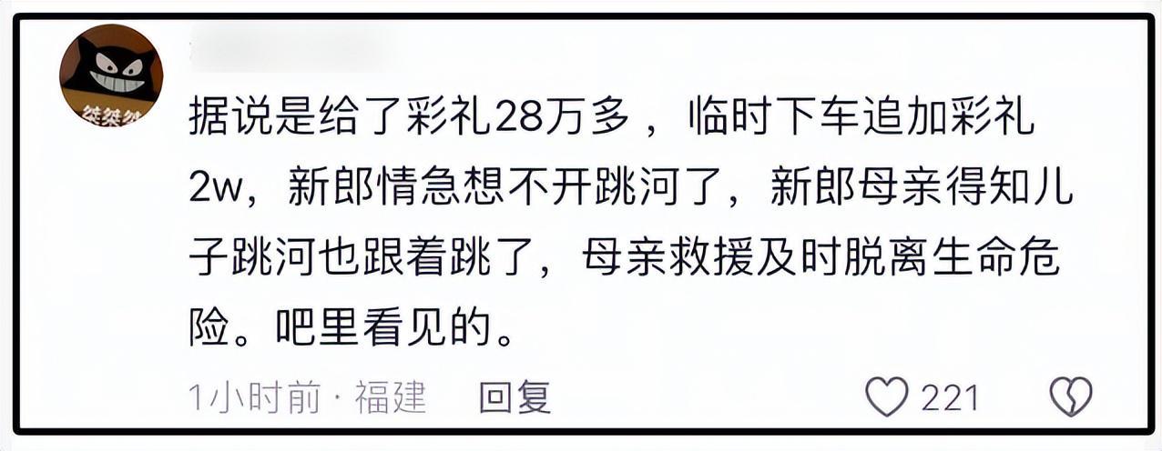 至于新郎,则被曝是大学老师,拥有研究生学历。如果爆料属实,新郎的父母培养出这么优秀的孩子实属不易。好不容易盼到了孩子成家,结果却喜事变悲剧,实在令人痛心,也难怪母亲会跟着一起跳河了。