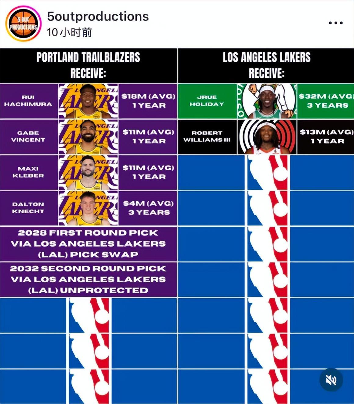 在观看首战后,美媒5outproductions迅速提出交易建议:湖人应尽快与开拓者达成6换2交易,引入霍勒迪与罗伯特·威廉姆斯(罗威)两位防守核心,而非继续依赖艾顿与里夫斯担任先发。