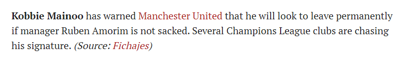 为了入选明年夏季世界杯的英格兰队大名单,梅诺曾在夏窗要求外租,以便更经常地参加比赛。但曼联拒绝了这一要求,并告知他要为自己的位置而战。然而,现在梅诺发现,B费无论如何都会首发,他只能在垃圾时间踢个十来二十分钟,这自然让他难以满意。