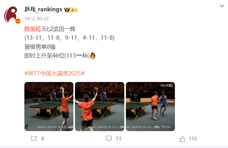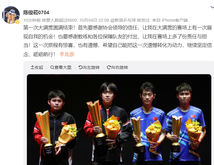 北京时间10月5日早晨,陈俊菘在社交媒体上发文,表达了对这次大满贯赛事的感慨。他感谢了协会领导的信任、教练和队友的付出,并表示这次旅程有惊喜也有遗憾。但他更希望将这次遗憾转化为动力,继续坚定信念,砥砺前行。