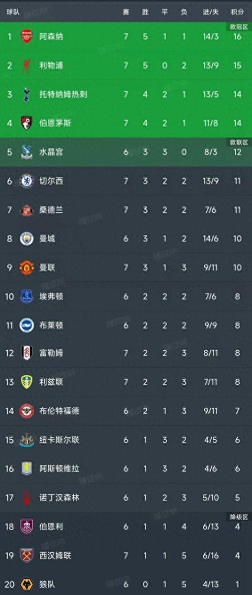 北京时间10月5日,英超第7轮赛事率先结束了5场焦点对决,最新积分榜随之出炉!本轮比赛高潮迭起,切尔西2-1绝杀利物浦成为最大看点,阿森纳2-0战胜西汉姆联登顶榜首,曼联2-0击败桑德兰,热刺2-1客胜利兹联,伯恩茅斯3-1力克富勒姆。以下是详细战况与积分榜分析。