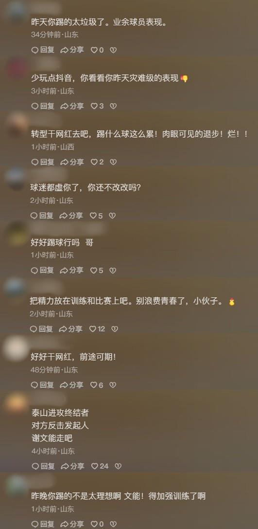 比赛结束后,谢文能的个人社交媒体账号被球迷的留言攻陷,火药味十足:“少拍点视频,别想着当网红!”“从国家队回来状态差到离谱,首发位置快保不住了!”此前,谢文能曾因休赛期学车、旅游而被批“躺平”,如今连训练态度都遭到质疑。相比之下,比谢文能还年轻的替补奇兵李小恒登场即扳平比分,谢文能79分钟的挣扎显得格外刺眼。