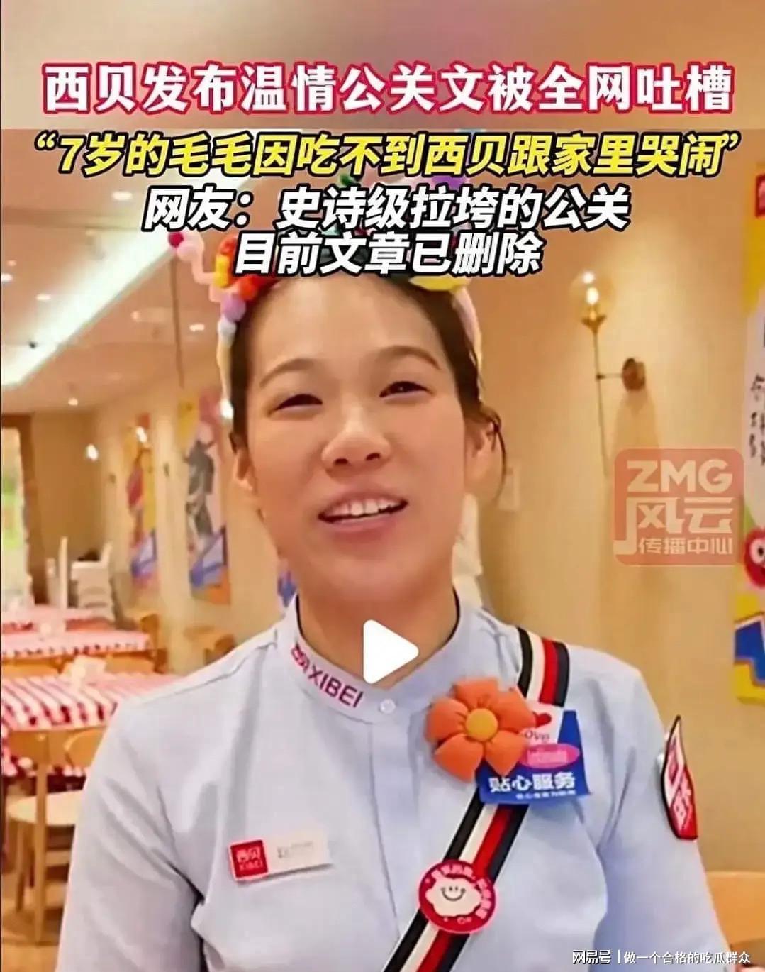 要说西贝的“魔幻叙事宇宙”,还得从那个让全网笑喷的“7岁毛毛”说起。在西贝的官方公众号里,一个7岁的小孩因为听说不能吃西贝,当场抱着店长大腿痛哭流涕,声称自己从2岁就离不开这口。然而,这剧情假得堪比抗日神剧,网友直接开怼:“现在的小孩精得很,演哭戏能不能走点心?”西贝见势不妙,迅速删除了文章,客服还嘴硬说是“顾客遭网暴”,对剧情的真实性却绝口不提。
