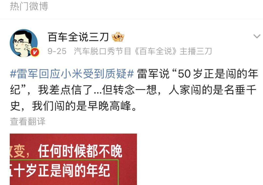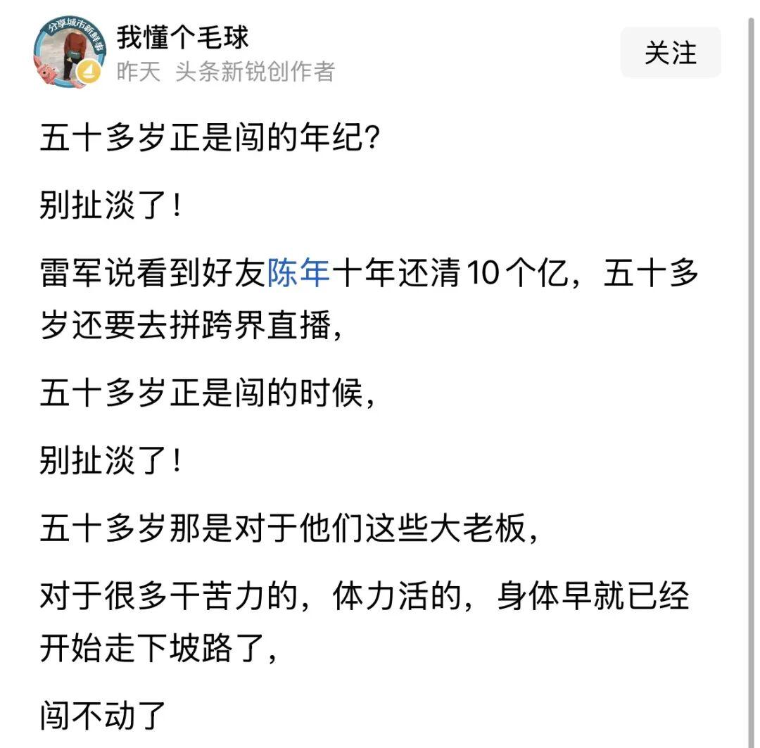 雷军的这句话迅速在网络上引发了两极反应。一部分人受到鼓舞,认为这句话传递了不畏年龄、勇于挑战的正能量。但也有不少人表达了现实的无奈。