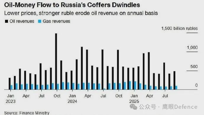 乌克兰针对俄罗斯能源工业的打击可谓双管齐下,同时打击俄罗斯炼油业和俄罗斯的石油、天然气出口。彭博社报道称,因为油价下降、卢布走强、制裁以及炼油厂遭攻击被迫将更多石油降价出口等缘故,俄罗斯9月份的石油出口收入为4850亿卢布,石油和天然气出口总收入则为5825亿卢布,相比去年同期分别下降了20%和25%,俄罗斯出口能源的收入正明显减少。