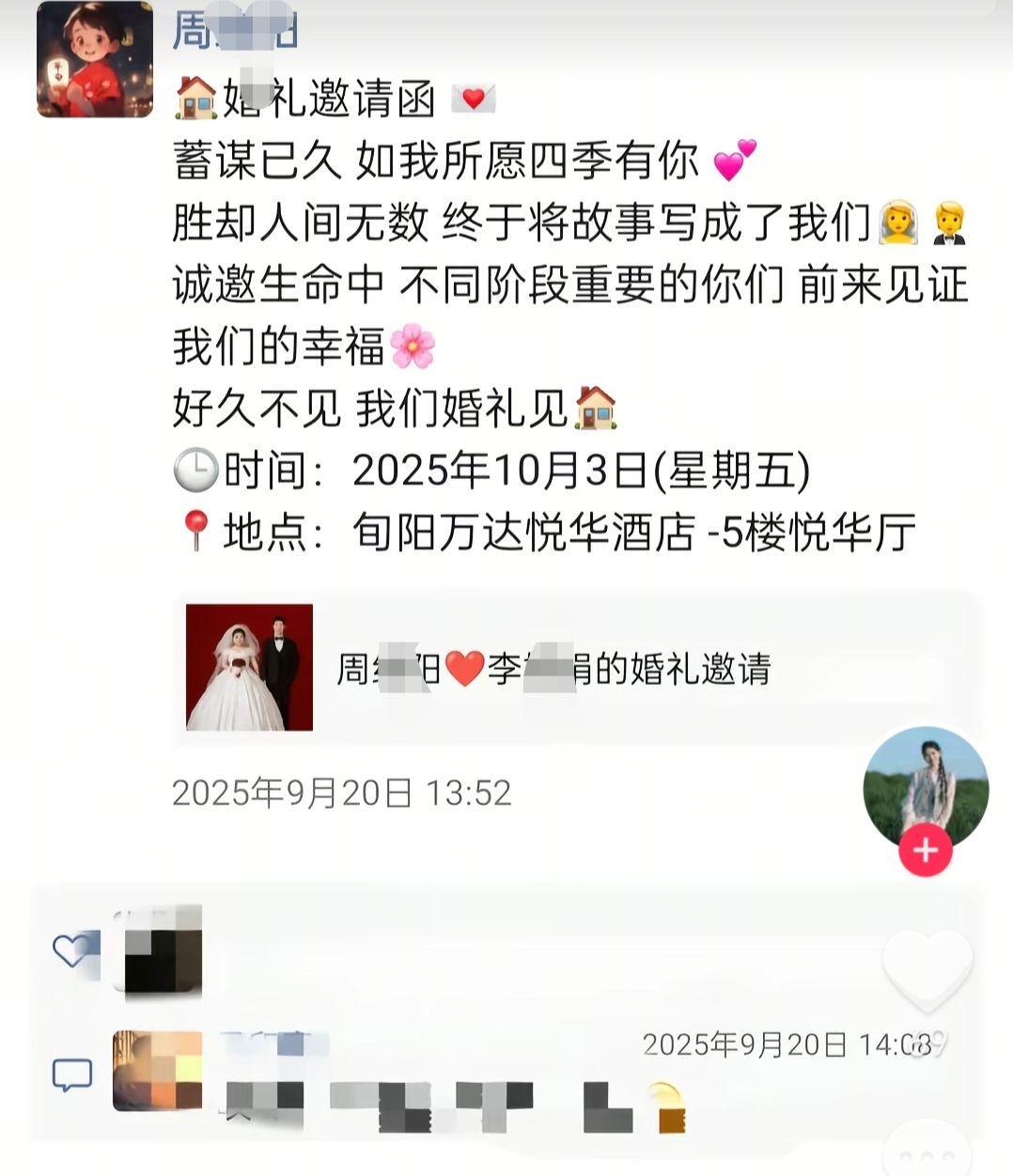 据悉,新郎周某阳对这场婚礼非常重视,他提前半月就在朋友圈发布了婚礼邀请函,邀请亲朋好友于10月3日齐聚酒店,共同见证他们的幸福时刻。他曾在朋友圈深情写道:“蓄谋已久,如我所愿,四季有你!”