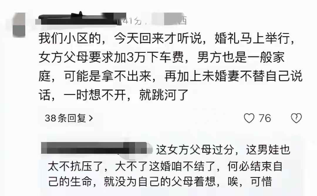 不过,新郎的父亲对于儿子跳河的原因并未明确说明,只是表示“很多事情,种种原因”,看来问题并不仅仅出在钱上。