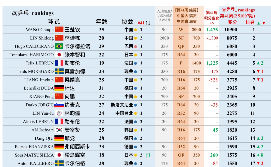 WTT北京大满贯赛事结束后,王楚钦在第41周的积分发生显著变化,增加了1475分,积分一举破万,达到10900分。而林诗栋的积分则减少了1300分,仅剩下8075分。凭借此次积分的大幅提升,王楚钦再度稳居世界第一的宝座。