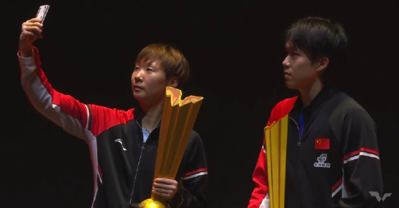 在两个单打冠军的手持自拍合影环节,王曼昱和王楚钦同样没有任何表情,仿佛他们并不是在领奖,而是置身于一场普通的比赛之中。
