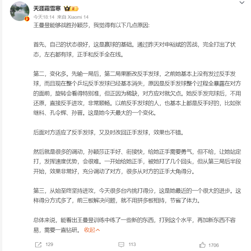 赛后,有体育大V分析了王曼昱赢球的三个关键要点,内容精简如下: