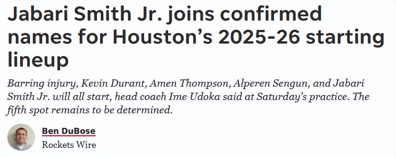北京时间10月5日,休斯顿火箭队主教练乌度卡在采访中正式确认,球队新赛季首发阵容已确定四个席位,其中第四位首发球员为小贾巴里-史密斯。他将与杜兰特、申京、阿门-汤普森共同组成首发阵容,而第五个席位仍在评估中,可能启用极具话题性的“死亡五大”阵容。