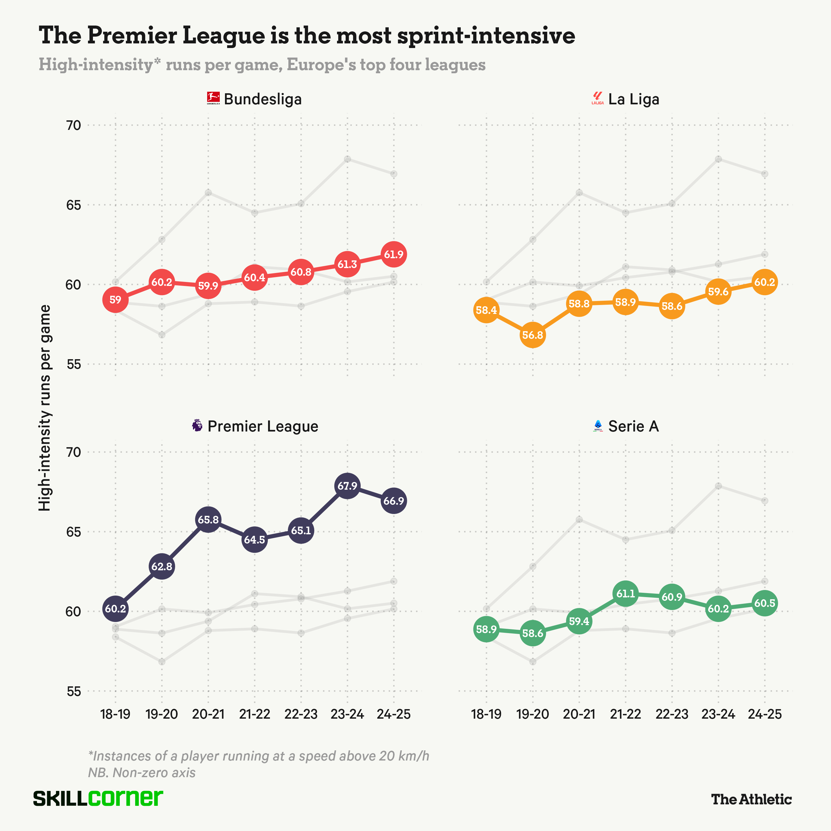 适应英超的强度是新援们常提到的挑战。SkillCorner的追踪数据显示,英超每场比赛的高强度跑动(速度超过每小时20公里)次数远高于西班牙、德国和意大利的顶级联赛。这一数据印证了新援适应的艰难。
