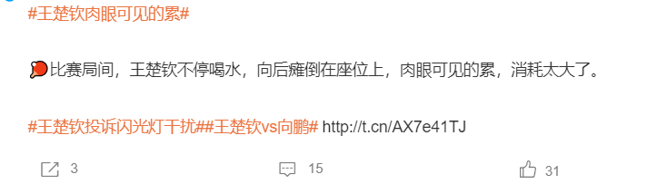 第一局,向鹏以11-8完成逆转后,王楚钦直接走向裁判,情绪激动地指出闪光灯干扰的问题。他与裁判沟通了长达30秒,显然对球迷的闪光灯干扰感到极度不满。【值得一提的是,昨天的女单半决赛中,陈幸同也遭遇了类似的闪光灯干扰,她甚至在比赛中直接申诉叫停了比赛。】
