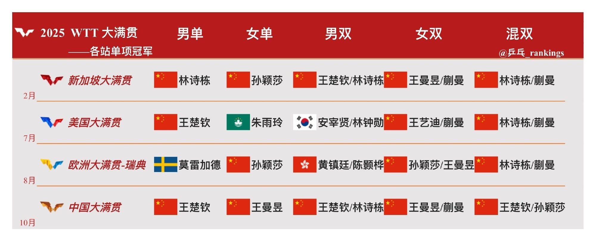 回顾过去的大满贯赛事,新加坡大满贯女单冠军由孙颖莎摘得,美国大满贯女单冠军则是朱雨玲,欧洲大满贯女单冠军再次被孙颖莎收入囊中,而中国大满贯女单冠军正是本次北京大满贯的胜者王曼昱。随着这些2000+积分的大满贯赛事的结束,世界排名的变化也将逐渐趋于稳定。