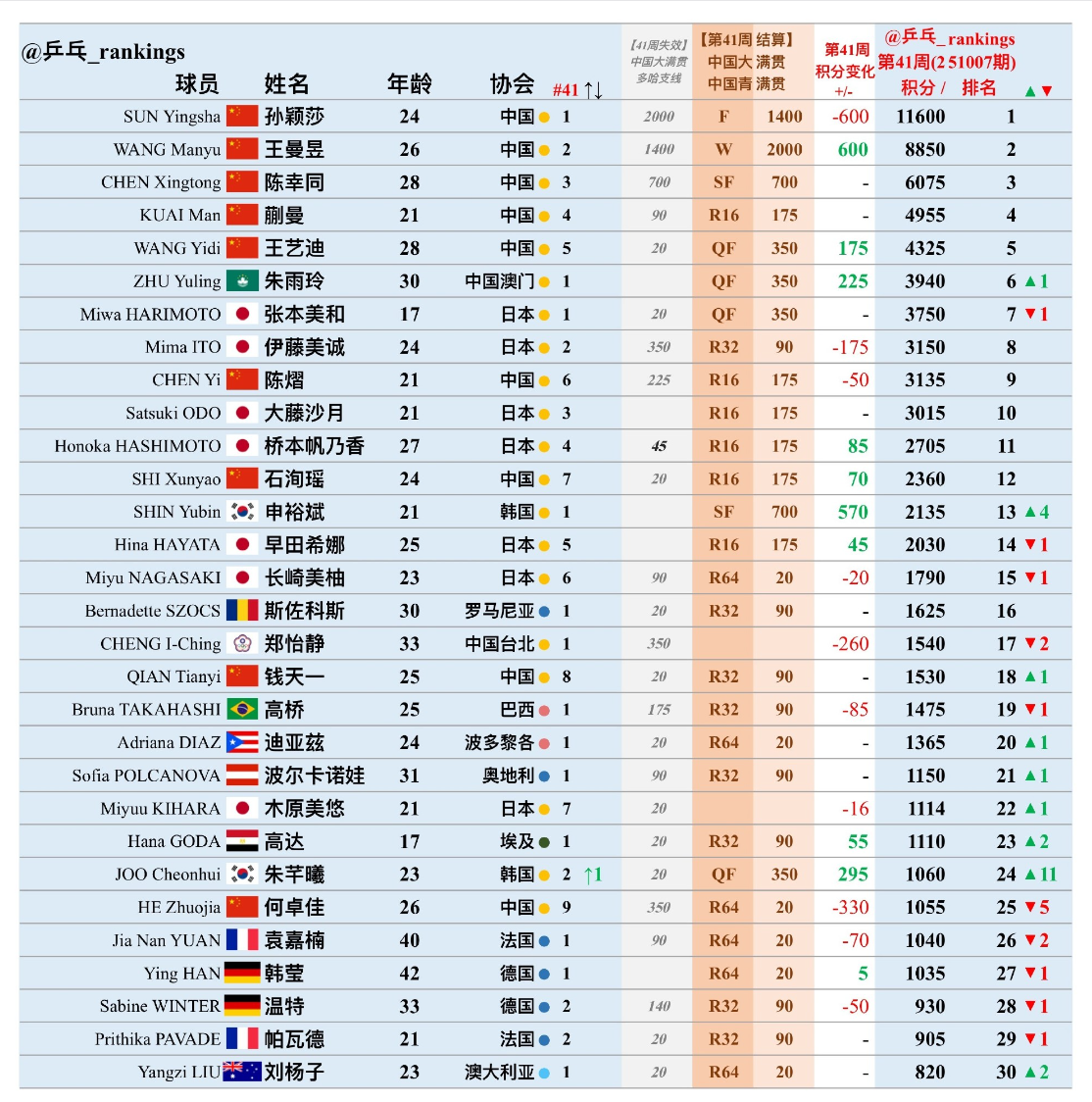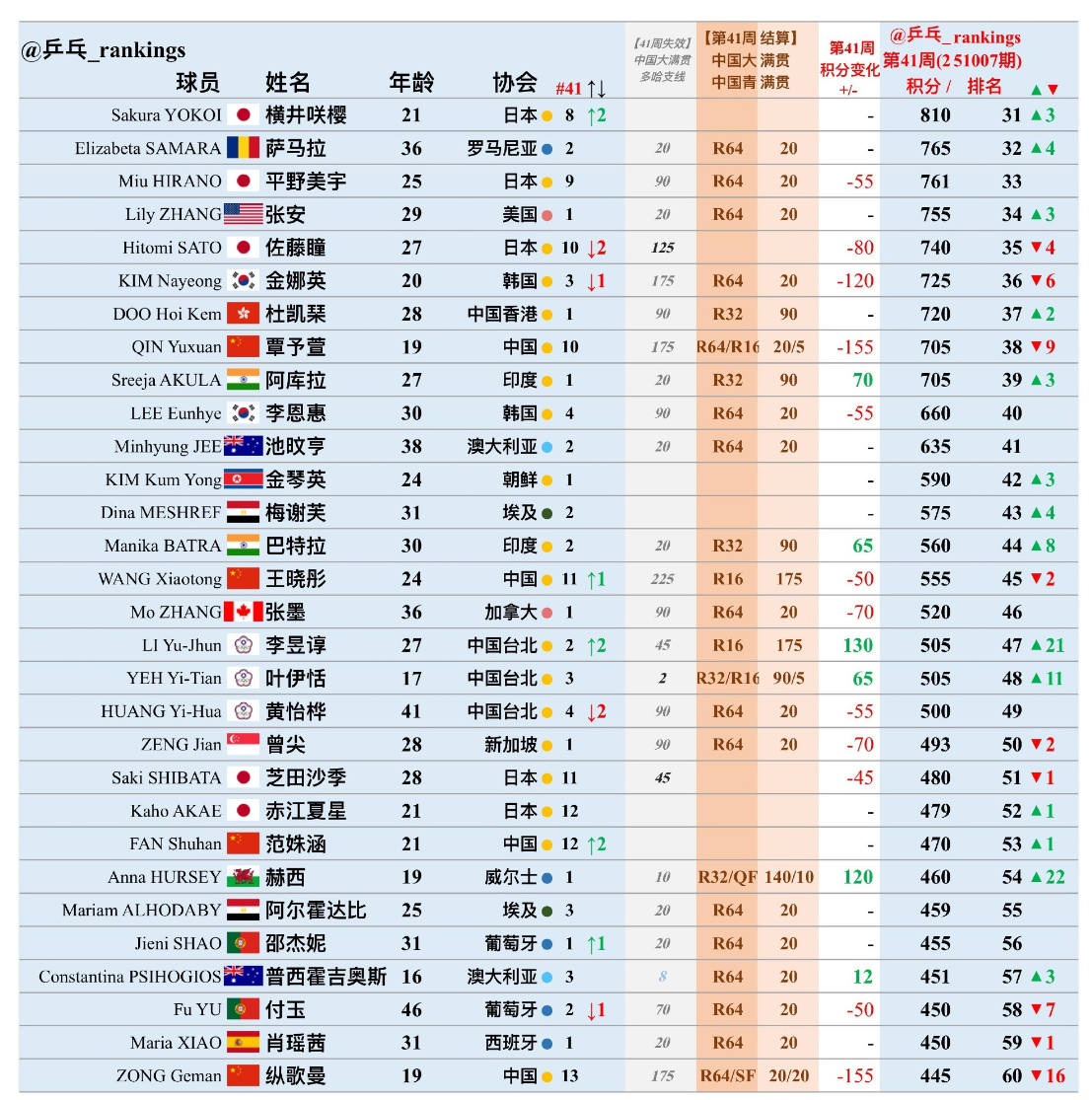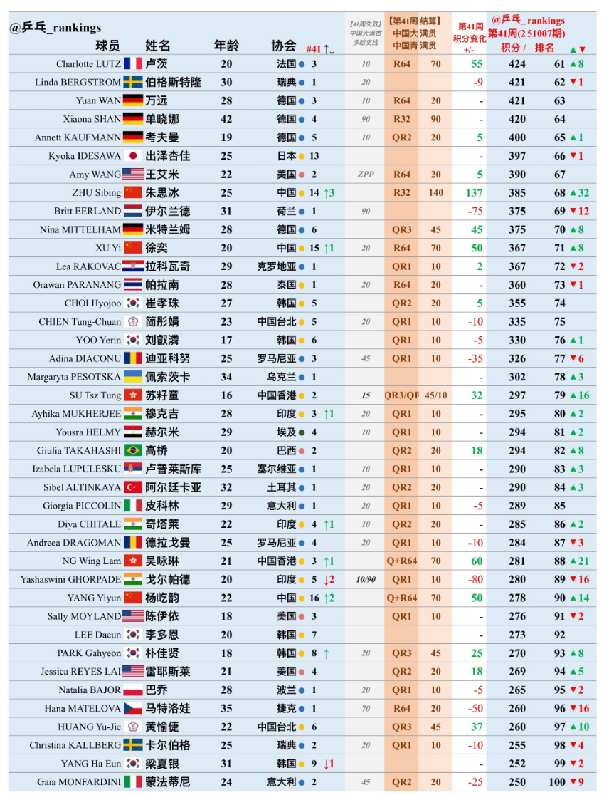 在年轻选手方面,19岁的覃予萱积分减少了155分,下滑到第38位;24岁的王晓彤积分减少了50分,下跌到第45位;19岁的纵歌曼积分同样减少了155分,直接下滑了16个位次,跌至第60位。