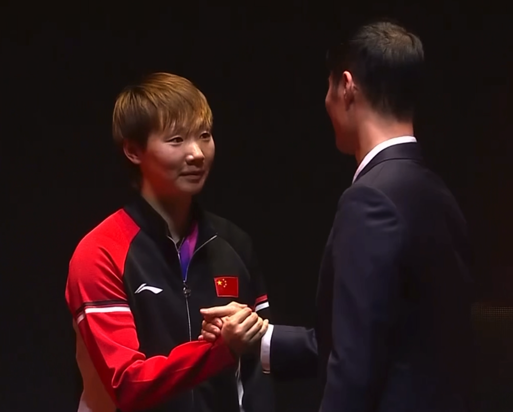 当王曼昱走上领奖台时,她原本保持着淡定的表情。然而,当王励勤走过来与她握手时,王曼昱立刻展露出了微笑。作为领导,王励勤的到来让王曼昱感到十分开心,两人相视而笑,场面十分温馨。