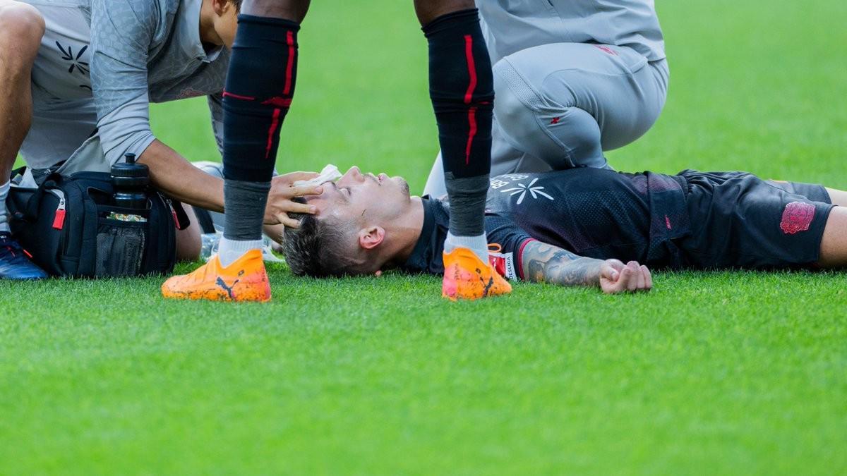 在勒沃库森对阵柏林联合的德甲联赛中,首发出战的格里马尔多在上半场第32分钟与对手发生激烈对抗,面部遭受重击后当场血流不止,最终被担架抬离球场。尽管伤势触目惊心,但这位28岁的西班牙左后卫通过社交媒体第一时间向球迷报平安,表示自己并无大碍。