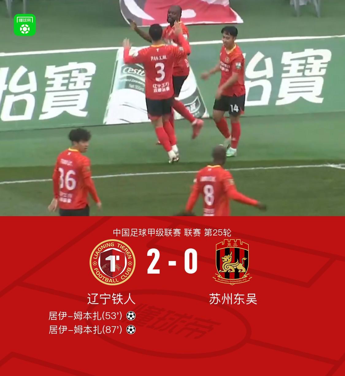 比赛临近尾声时,邦本宜裕在左路送出高质量传中,姆本扎高速前插至小禁区前沿,力压防守球员头球冲顶破门,完成个人本场第二个进球!辽宁铁人将比分扩大至2-0,彻底杀死比赛悬念。