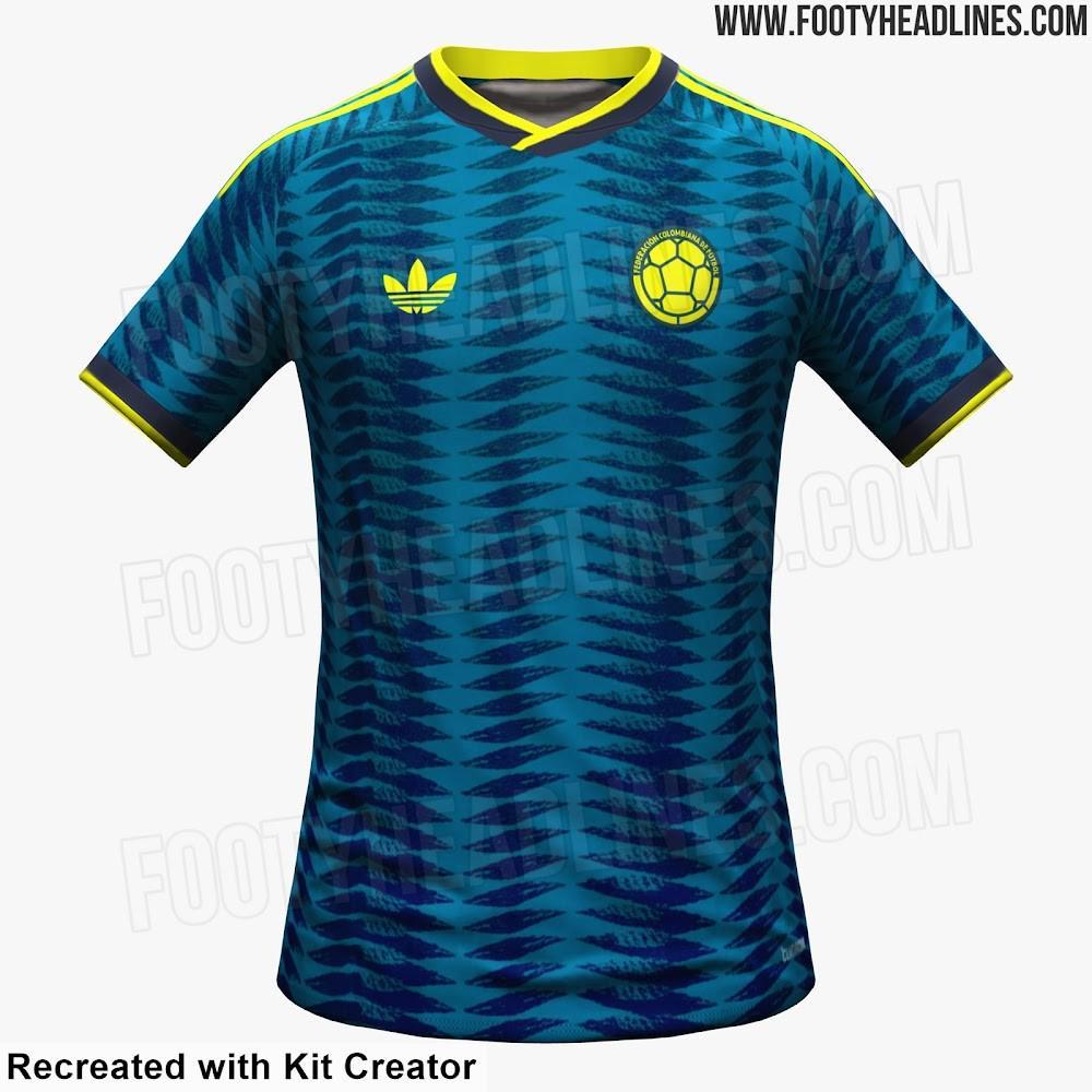 客场球衣则以“Team Navy Blue”(深海军蓝)为主色,设计上融入了类似羽毛状的图案,有哥伦比亚媒体认为这一灵感来源于马尔克斯写作时所用的羽毛笔,且《百年孤独》封面上也曾使用过类似图案。徽标部分则采用哥伦比亚标志性的亮黄色,与深蓝色形成鲜明对比,彰显独特风格。