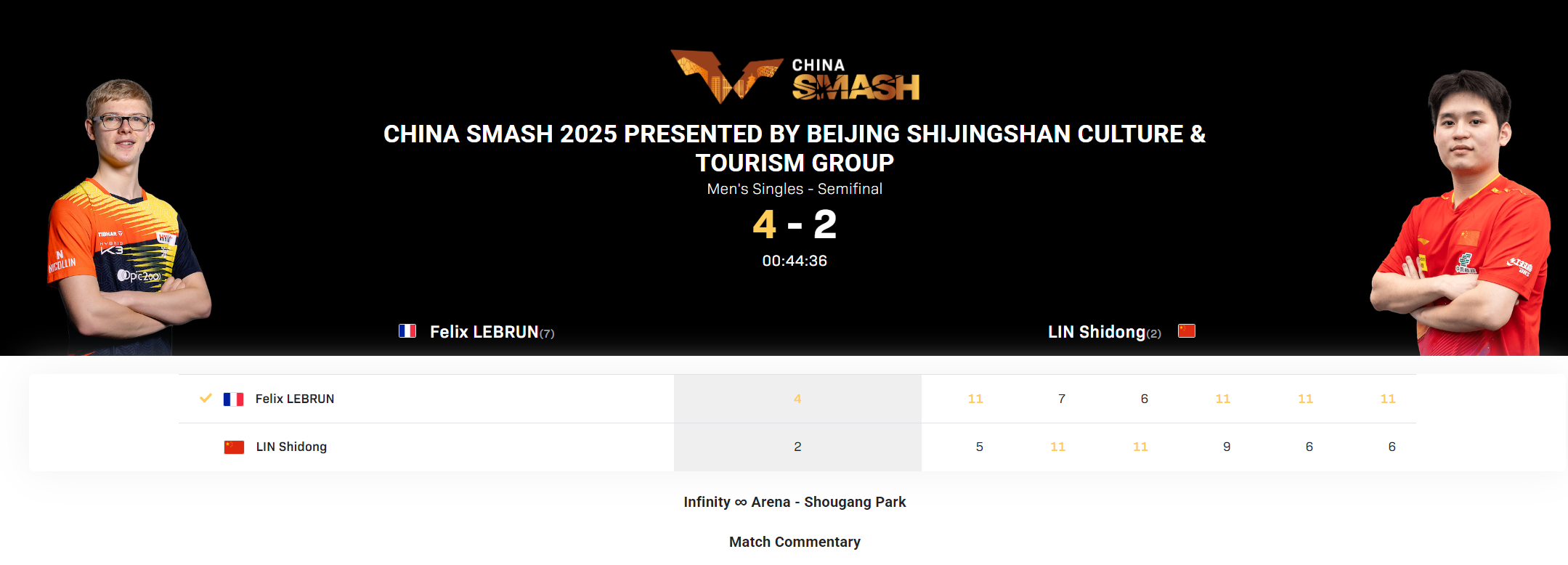 WTT北京大满贯男单半决赛:林诗栋2-4小勒布伦【5-11,11-7,11-6,9-11,6-11,6-11】;
