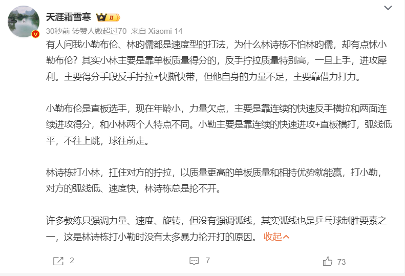 比赛转折点出现在第四局。当时林诗栋以8-7领先,却被小勒布伦的快速攻防转换以9-8反超。小勒布伦10-8拿到局点后,林诗栋气势骤降,最终以9-11被扳平比分。此后两局,林诗栋完全被压制,未能再展锋芒。