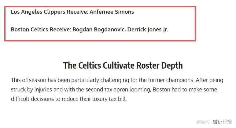 面对这样的困境,媒体FW在常规赛尚未开始之际,便策划了一笔快船与凯尔特人的潜在交易。根据该方案,快船有望抄底双能卫安芬尼-西蒙斯,而两名替补轮换球员博格丹-博格达诺维奇和小德里克-琼斯,则可能因新赛季戏份减少而被球队抛弃。
