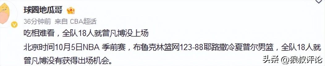 曾凡博在篮网队的待遇问题,一时间成为了热议的焦点。有球迷直言不讳地表示:“全队18人就曾凡博没上场,这吃相太难看了。”