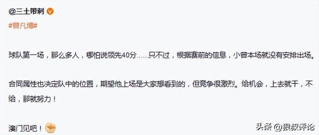 媒体人三土带刺也发文点评了此事,他表示:“球队第一场那么多人,哪怕领先40分,小曾也没有获得出场机会。合同属性决定了他在队中的位置,期望他上场是大家想看到的,但竞争确实很激烈。给机会就上,不给就努力!”