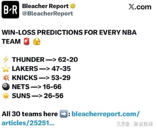 近日,知名体育媒体BR对各支球队的常规赛战绩进行了预测。其中,湖人和勇士被预测将取得相同的战绩——47胜35负。而卫冕冠军雷霆则以62胜的战绩领跑全联盟,展现出强大的统治力。相比之下,布鲁克林篮网则因阵容薄弱被预测将垫底,毕竟他们的阵容实力确实有限,也缺乏足够的战绩压力。
