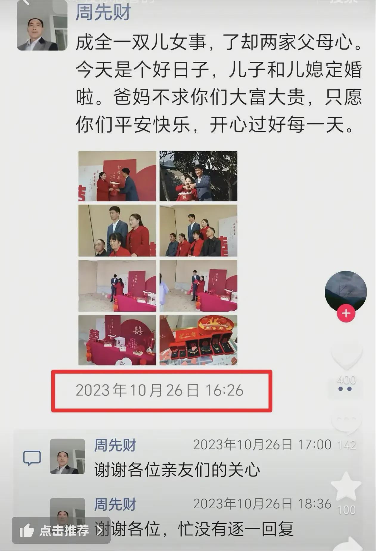 从新郎爸爸的朋友圈中可以看出,两人于2023年10月26日举行订婚仪式,当时新郎的爸爸还开心地发了多张订婚现场图片的朋友圈。可以看出,他对儿子的期待和希冀。
