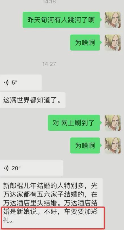 此事发生后,有人说,是因为新郎临时起意索要2万块钱的下车礼,新郎怎么劝新娘下车,她都不肯不下车,新郎一气之下,跳河了。