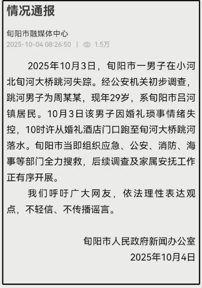 事后,新郎的父亲发声称,新郎跳河跟下车礼无关。