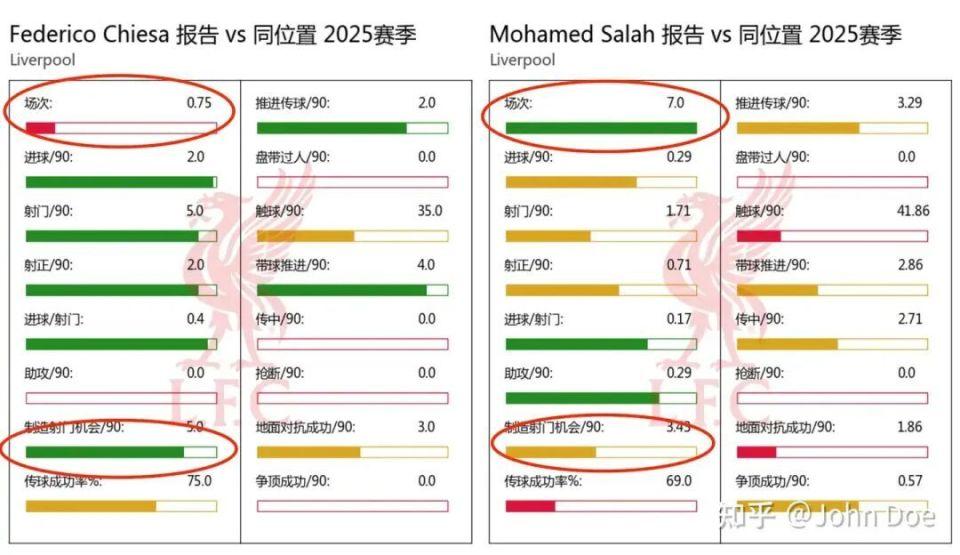早在5月笔者就曾撰文指出,萨拉赫斋月后的状态断崖式下滑已成为锋线换代的阻碍。当时数据显示:当萨拉赫占据强侧时,其场均SCA(关键传球+射门)仅2.5次,过人次数归零,地面对抗成功率2.4次,推进传球3.8次且成功率不足70%,这些数据在五大联赛同位置球员中几乎垫底。