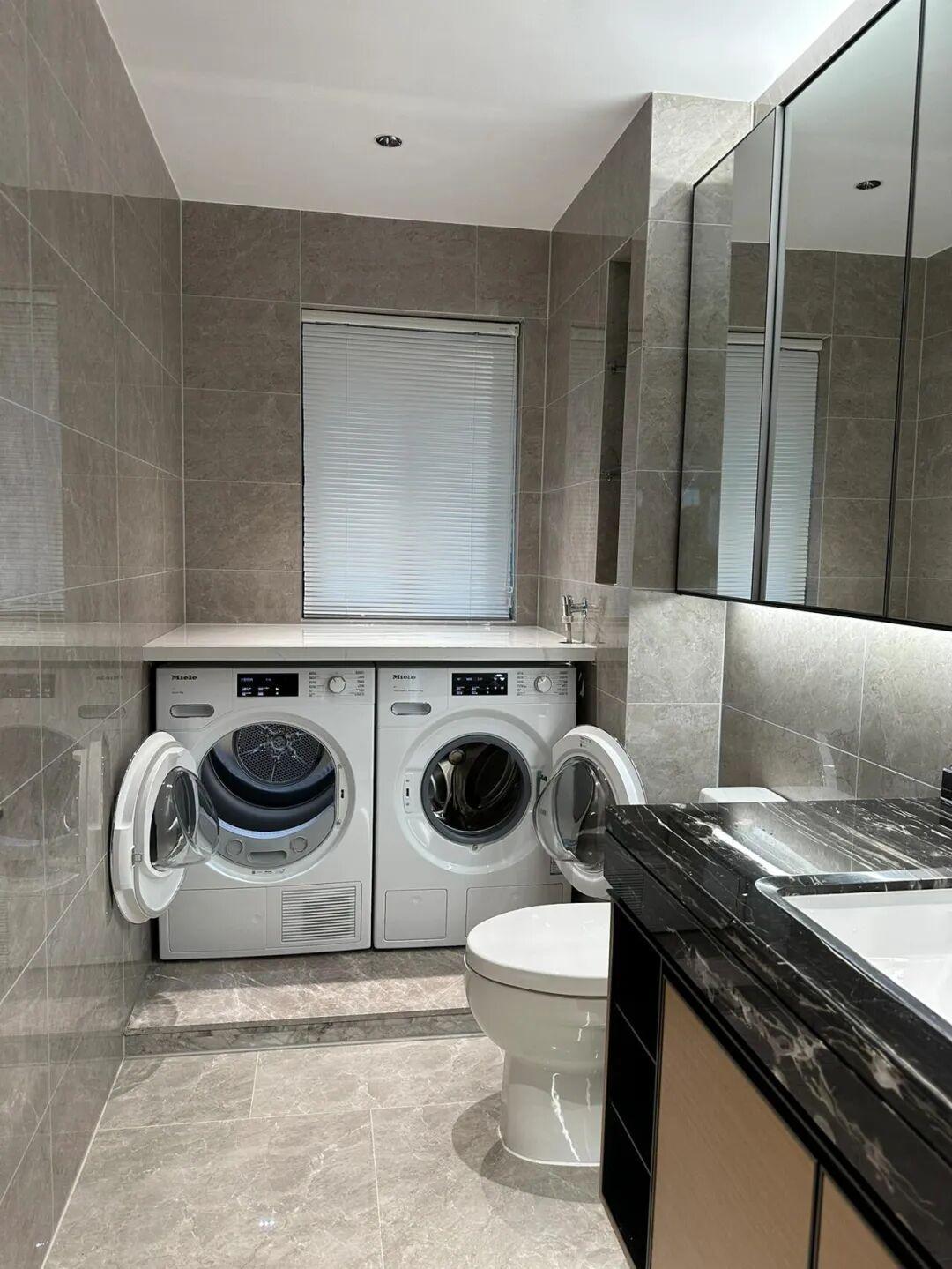 定制一组洗衣柜,将洗衣机和烘干机塞进去,上面再安装一根晾衣杆,完全满足了洗、烘、晾等功能,并且还不会影响到卫生间通风。