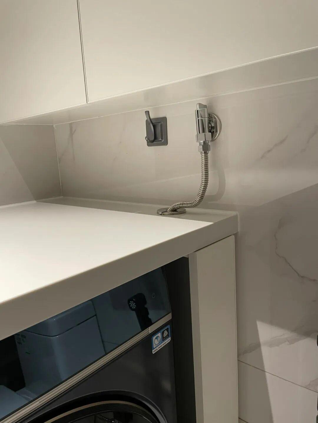 原有的花洒出水口改成洗衣机出水孔,下水管明装连接到地漏处,再从马桶插座处排一路线,就解决了洗衣机的水电需求。