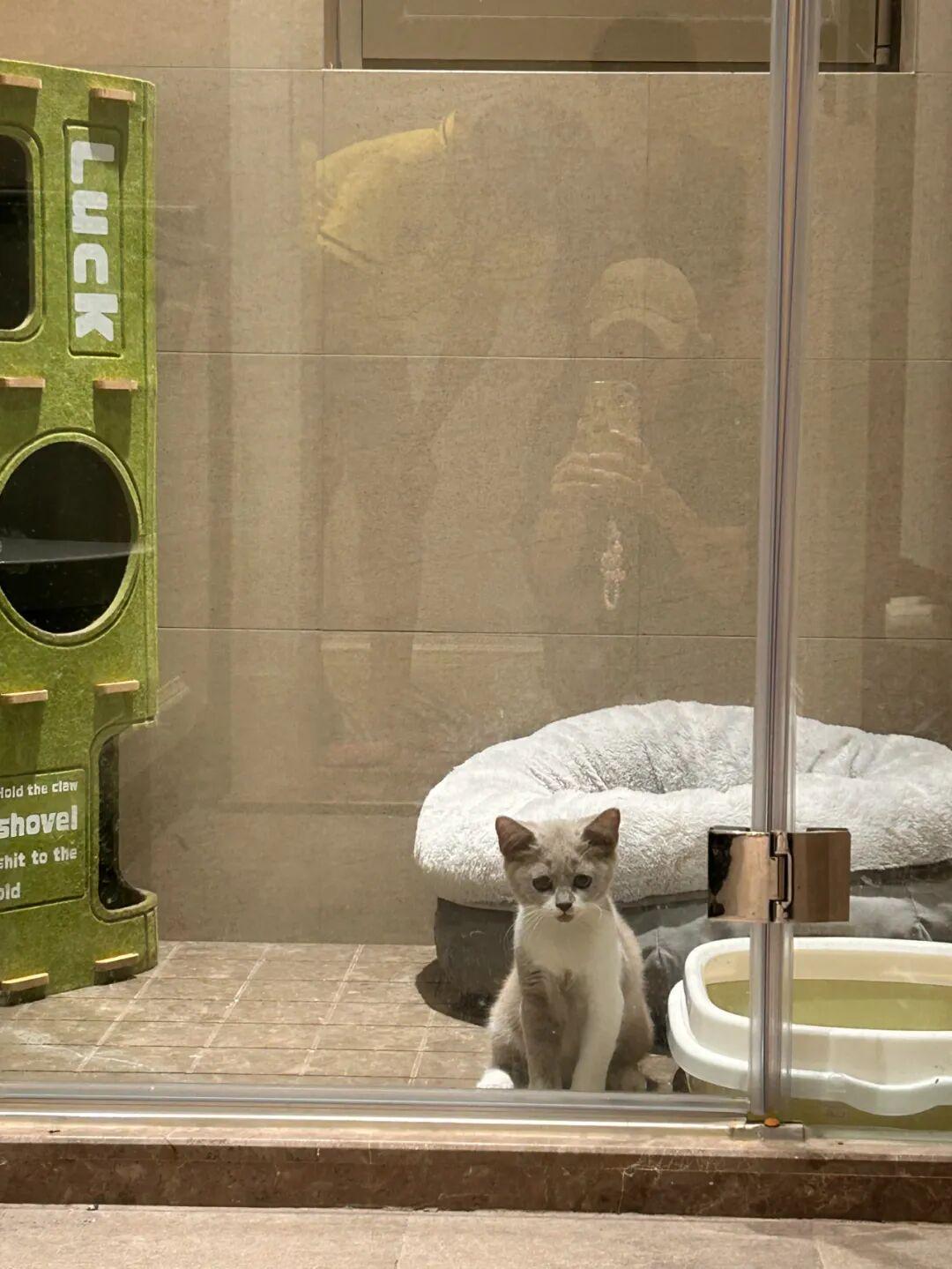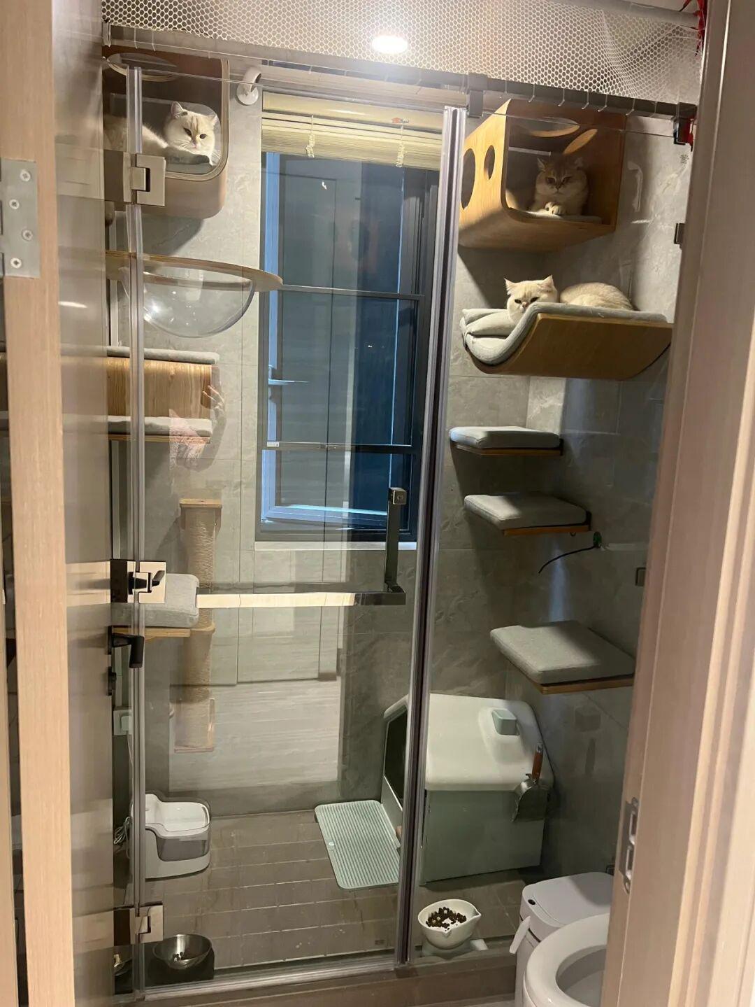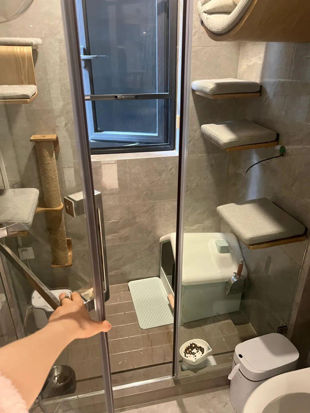 拆掉原有的花洒,安装上各种猫架,小是小了一点,但养三只猫没有一点问题。这样一来,不仅方便了它们休息、吃饭、上厕所,还彻底实现了人猫分离。