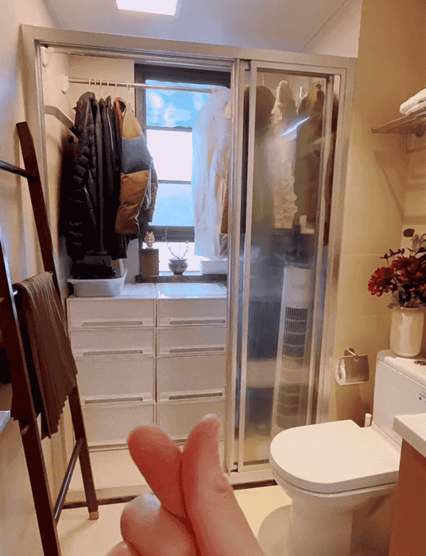 网友@晚风:我家里只有一个阳台,本着不想阳台常年衣物飘飘的原则,就把闲置的主卫淋浴区改成了洗衣间。