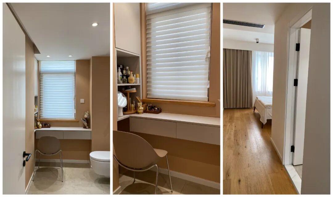 网友@暖和融:主卫的洗漱区,虽然也可以化妆,但站久了难免会有一点累。因此,就在淋浴区内设计了一个30cm宽的梳妆台,再搭配上侧面的收纳柜,立马舒适多了。