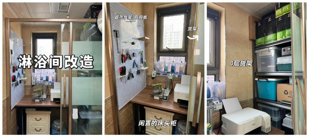 网友@小李爱生活:我是把淋浴区改成了一块工作区,平时在这里操作3D打印机,不仅空间刚好够用,还解决了打印材料的收纳。