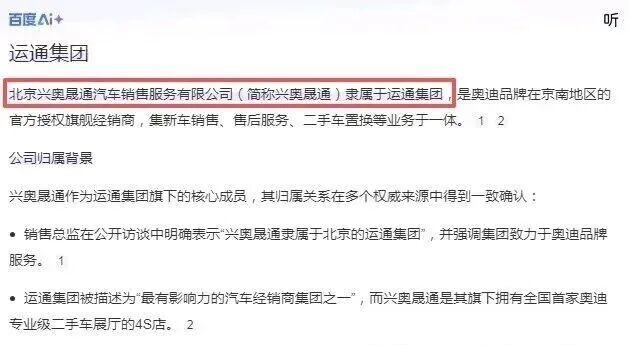 值得注意的是,兴奥晟通4S店并非独立经营的小门店,其曾获“北京市汽车流通行业转型升级示范企业”称号,是运通汽车集团旗下重要门店之一。这家始创于上世纪(参数丨图片)80年代的汽车集团,2024年还以第294位跻身中国民营企业500强,旗下拥有60余家4S店,覆盖劳斯莱斯、奥迪等18个品牌,豪华品牌占比高达86%,2023年汽车板块总收入达413.17亿元。