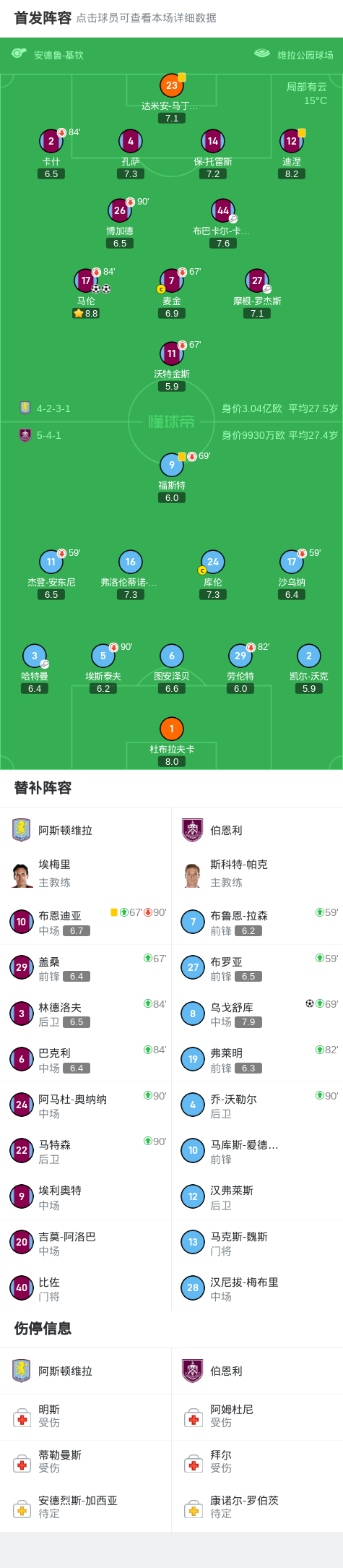 本场比赛维拉控球率达到58%,完成14次射门其中7次射正。伯恩利虽然控球率处于劣势,但创造了12次射门机会。马伦当选全场最佳球员,乌戈舒库的进球则为伯恩利保留了颜面。
