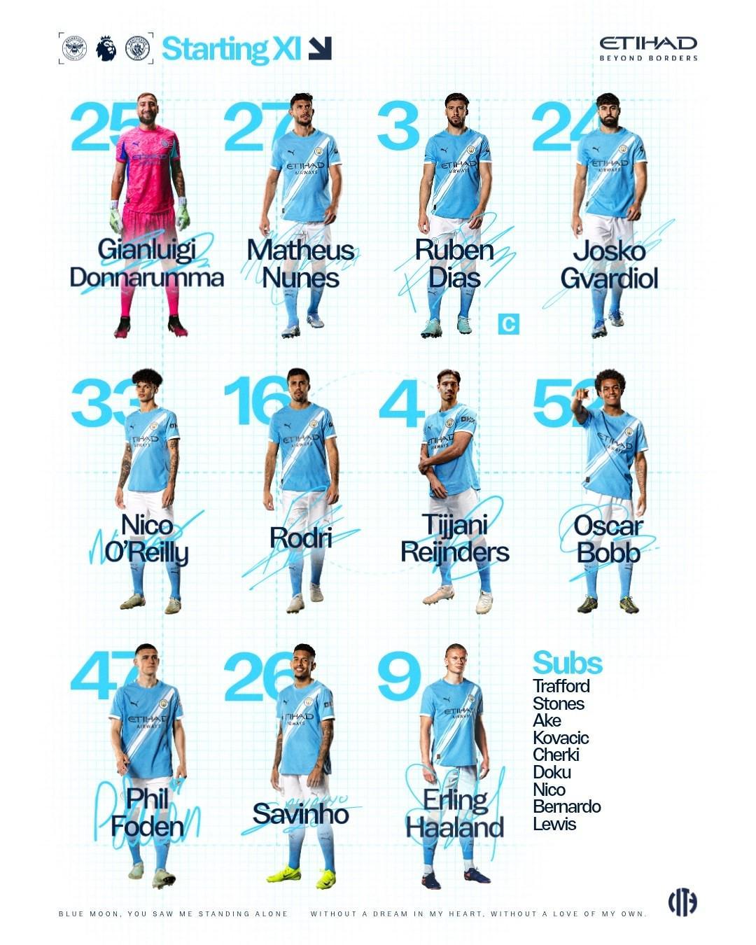 曼城首发阵容方面,门将位置由25号多纳鲁马把守,后防线则由33号尼科-奥赖利、24号格瓦迪奥尔、3号鲁本-迪亚斯和27号马特乌斯-努内斯组成。中场方面,16号罗德里和4号赖因德斯将承担起攻防转换的重任,而52号奥斯卡-鲍勃和47号福登则将在两翼提供支援。锋线上,26号萨维尼奥和9号哈兰德这对黄金搭档将携手出击,为曼城攻城拔寨。