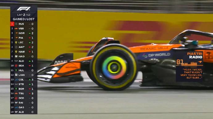 第一圈,诺里斯凭借出色的起步升至第三位,但在与皮亚斯特里的激烈争夺中,不慎碰到维斯塔潘的赛车,导致前翼端板受损,为后续比赛埋下隐患。