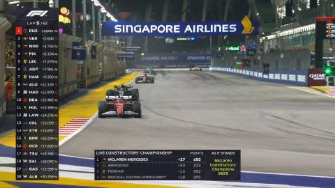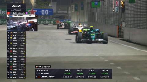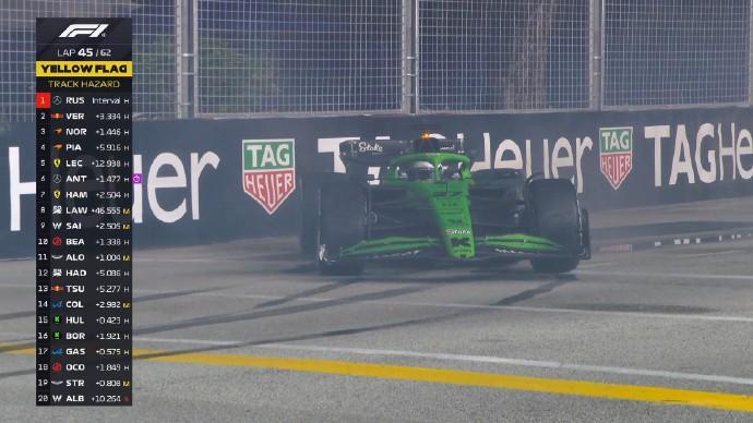 第五十九圈,换上软胎的塞恩斯冲击积分区最后的位置,汉密尔顿和安东内利争夺第五名,诺里斯和维斯塔潘则继续为亚军展开激烈争夺。