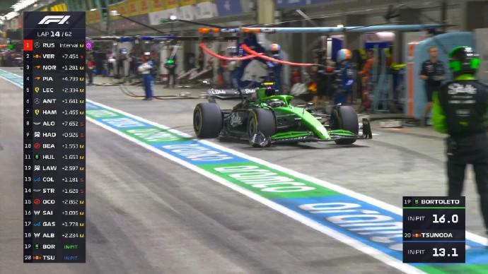 第十四圈,博托莱托和角田选择进站,索伯车队为赛车更换了发车阶段与斯托尔碰撞受损的前翼。第十六圈,迈凯伦车队与诺里斯讨论通过undercut策略超越维斯塔潘,而红牛车队则一直在管理起步时的软胎。