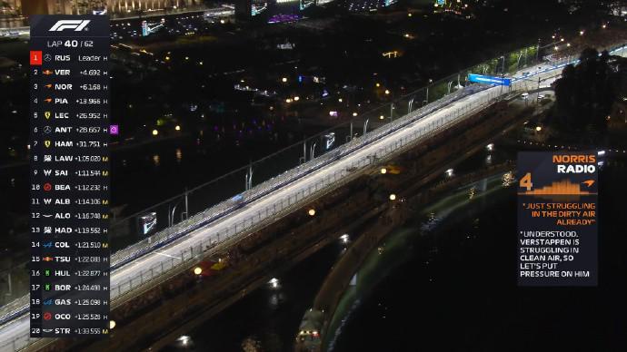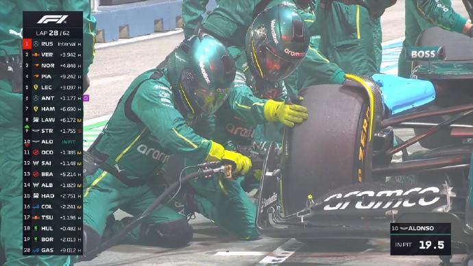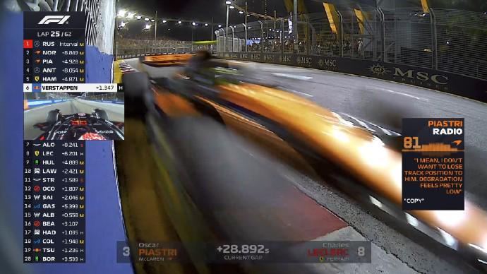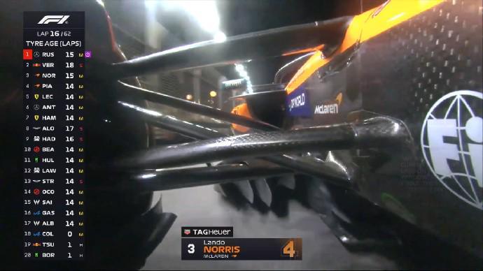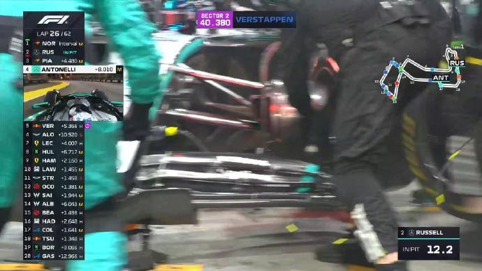 第二十五圈,皮亚斯特里决定继续使用中性胎,而维斯塔潘则追至汉密尔顿身后,法拉利车手也选择进站调整策略。第二十六圈,拉塞尔进站,出站后落在第四位,冠军争夺再生变数。