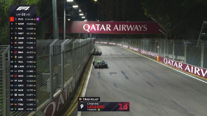 第二十圈,维斯塔潘进站并换上全新的硬胎,试图通过轮胎优势缩小与拉塞尔的差距。第二十二圈,勒克莱尔进站,并在霍肯伯格身后完成关键超越,展现出法拉利车手的实力。