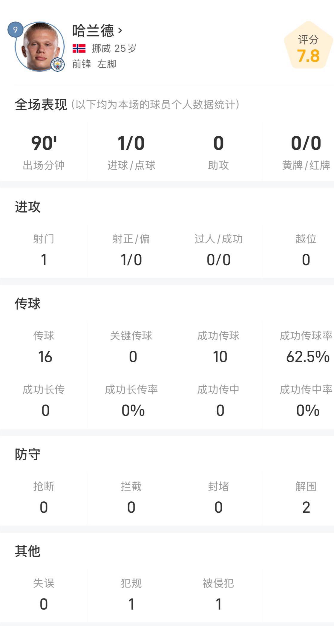 本场比赛,哈兰德作为曼城的首发中锋,不仅踢满了全场,更是在关键时刻挺身而出,打入了全场唯一的进球。尽管全场比赛他仅贡献了1脚射门,但这脚射门却精准无比,直接洞穿了布伦特福德的球门。此外,哈兰德在传球方面也有着不俗的表现,16次传球成功率达到了62.5%,同时在防守端也贡献了2次解围,展现了其全面的能力。赛后,机器评分系统为哈兰德打出了7.8分的高分。