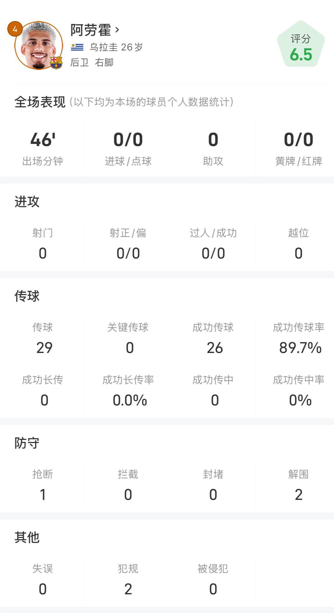 此役,阿劳霍首发出场,但在中场休息时被教练组换下,仅踢了45分钟。据赛后统计,阿劳霍全场贡献1次抢断、0次拦截和2次解围,然而他在禁区内的一次犯规却直接送给对手点球,成为比赛转折点之一。此外,他还有2次犯规记录,传球29次,成功率高达89.7%,但整体表现难言出色,赛后机器评分仅为6.5分。